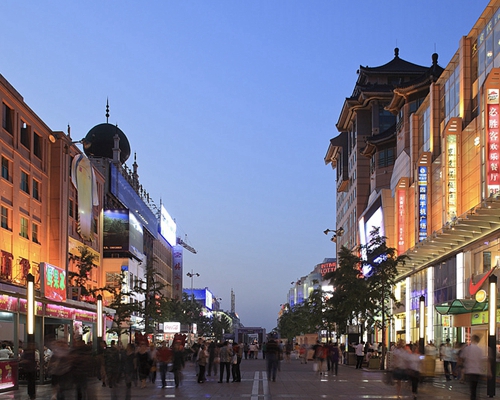 La via Wangfujing si sviluppa dal tratto Est di Viale Chang'an fino al Museo Nazionale d'Arte della Cina, per una lunghezza di circa 1.600 metri. È una delle zone commerciali più celebri e rinomate di Beijing.